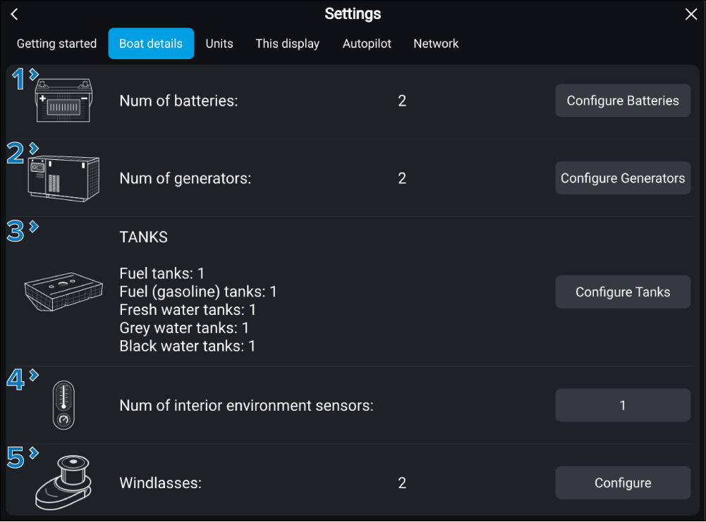 WindlassesWindlasses configuration Provides the current number of windlasses. Select Configure to see a list of detected Windlasses and related settings. |