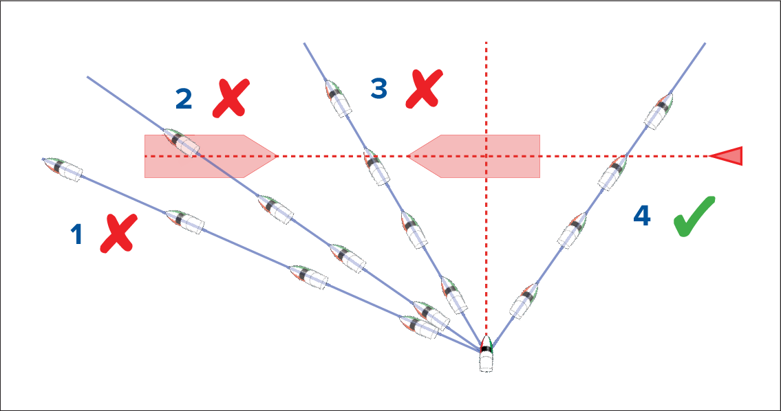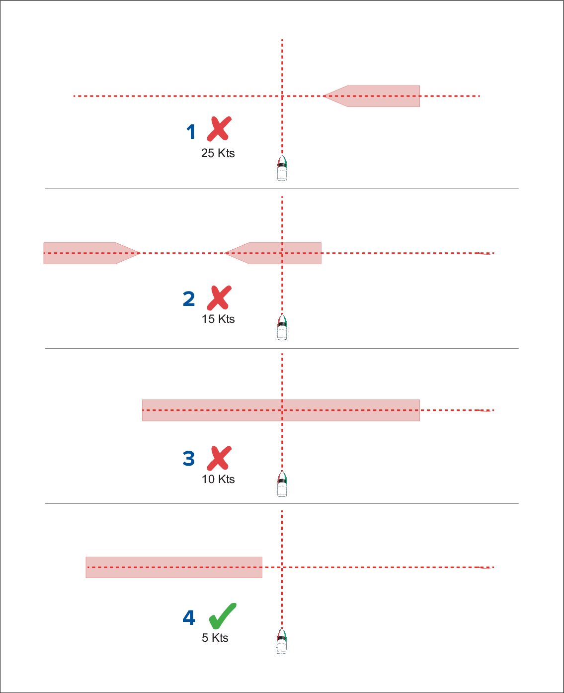 - Speeding up [Not recommended] — Increasing vessel speed to pass ahead of the target vessel. Proceed with caution, there is always an inherent risk when passing in front of other vessels.