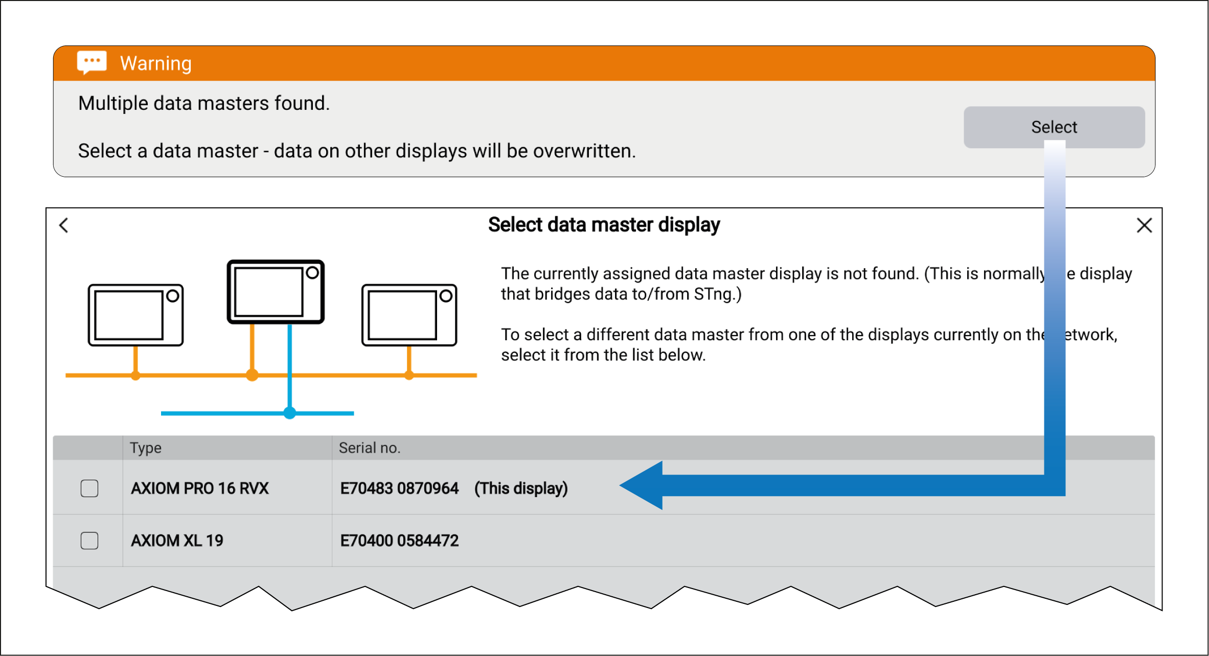 If you are selecting a new datamaster then all networked displays’ settings and any saved waypoints, routes and tracks will be overwritten with those of the new datamaster display. To prevent loss of data and settings perform a back up of data and settings on the current datamaster before assigning a new datamaster.