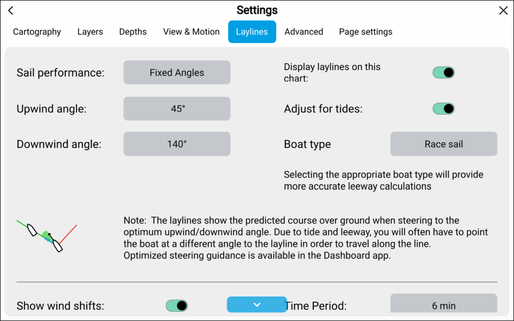 Laylines Adjust for tidesAdjust for tides — When enabled layline calculations will take into account tidal flow and leeway.