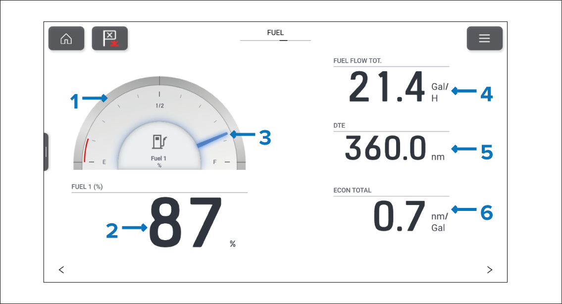 The fuel data page is always available. The number of fuels tanks displayed on the fuel page is based on the number of fuel tanks selected during the initial MFD start up wizard. If more than 1 fuel tank is selected then the first 2 tanks will be displayed. The fuel page includes data relevant to fuel usage and includes a graphical fuel dial.