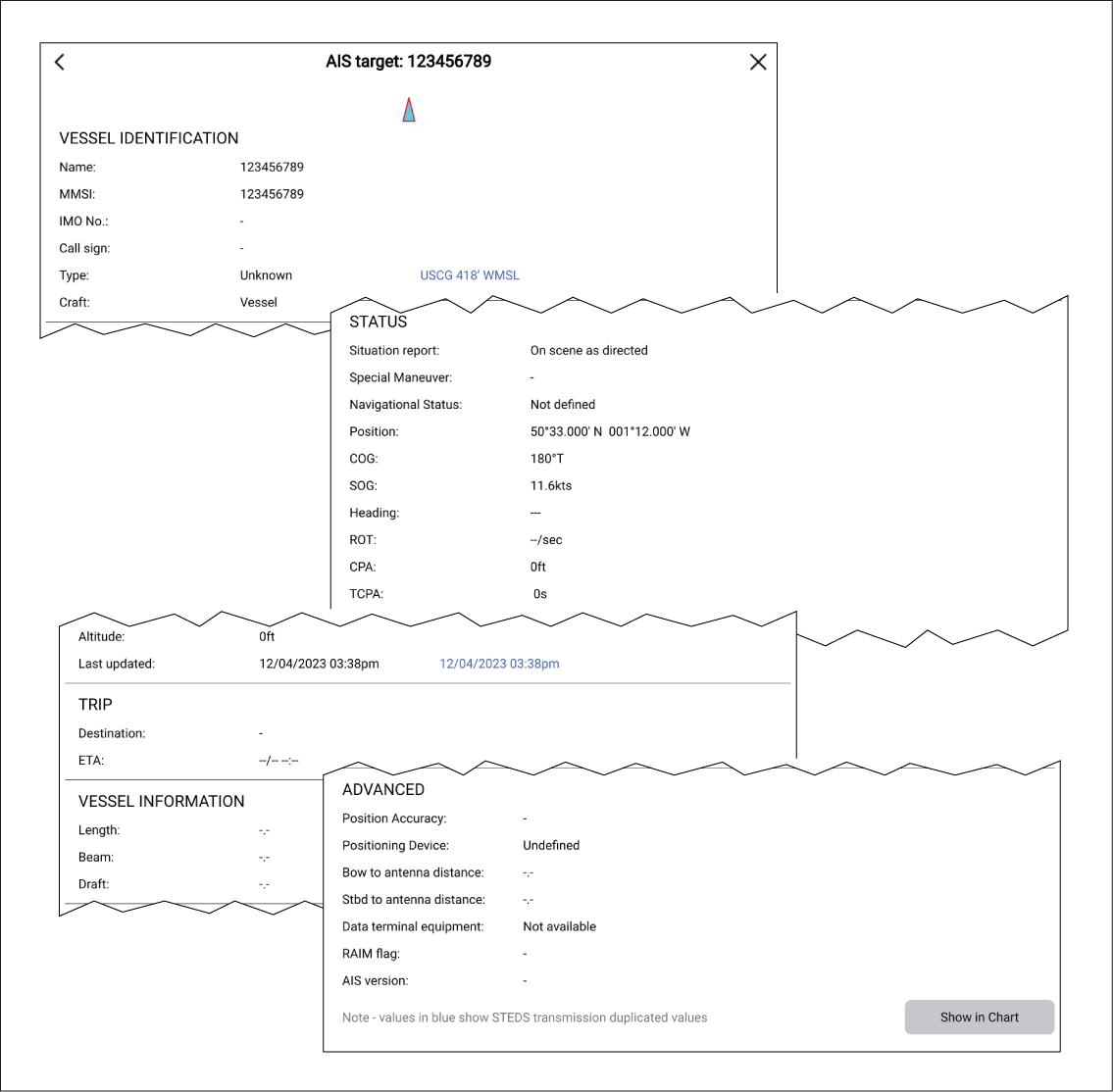 When the MFD is configured using the First Responder activity and the system includes a STEDs-compliant AIS transceiver, duplicated STEDs transmission data will be shown in blue, to the right of the AIS data item.