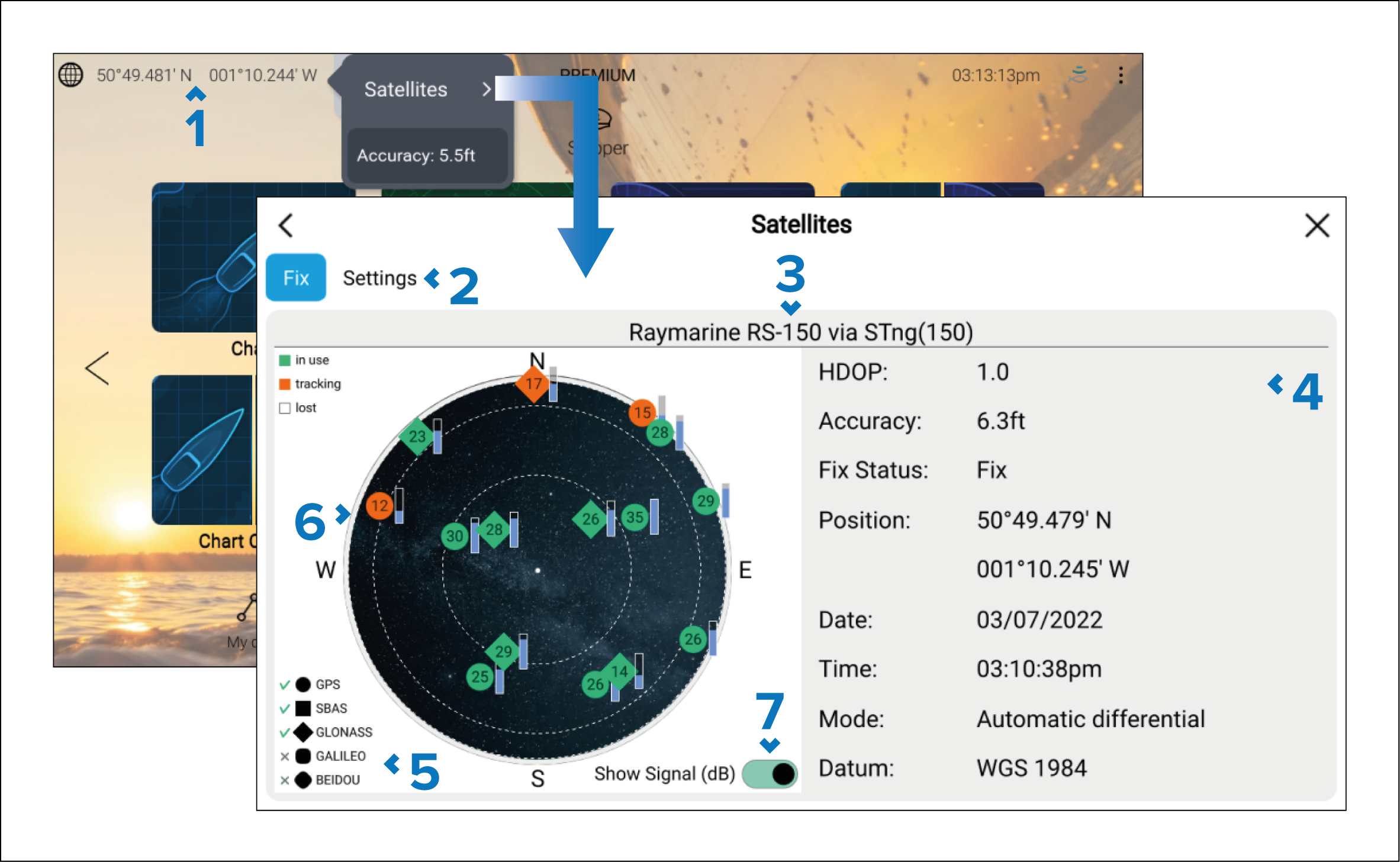 Your vessel’s GNSS (GPS) position is displayed in the top left corner of the Homescreen. The status of the position fix and the satellites in use is displayed in the Fix menu.