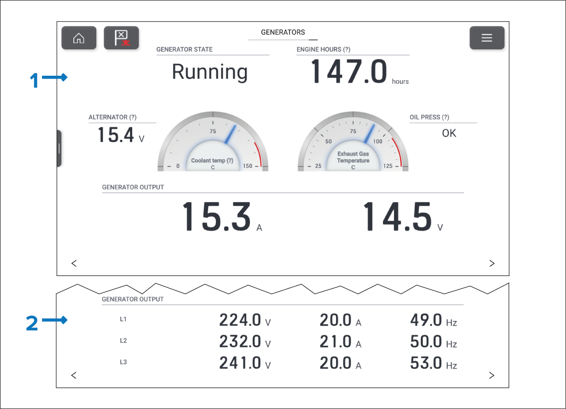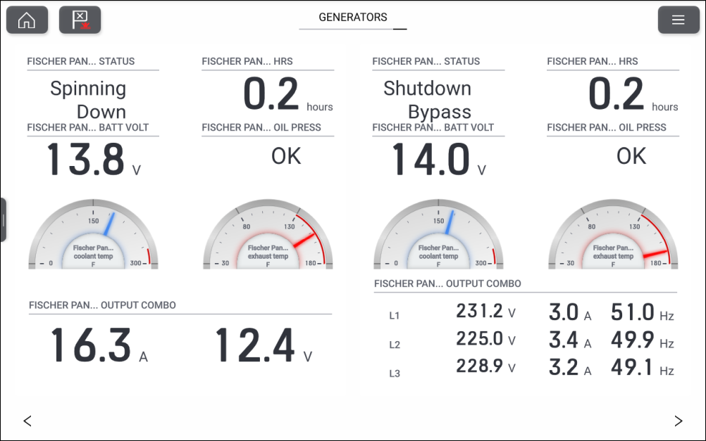 When the display detects generators which transmit supported NMEA 2000 PGNs, a pre-configured generator page will be available in the Dashboard app.