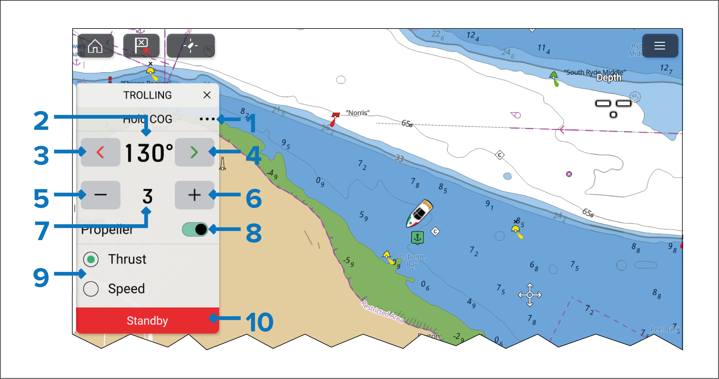 Standby — You can select Standby at any time to place the Trolling motor into standby mode.