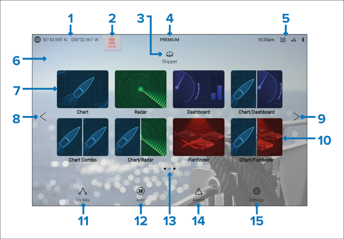 App page iconsSplitscreen app page icon — Select an icon to open the relevant MFD app page. App pages can contain more than 1 MFD app. For details on creating new homescreen app pages refer to: Creating an app page