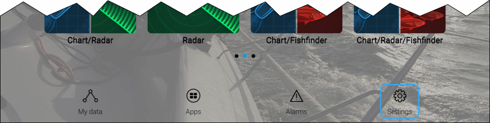 Homescreen Settings menuMenusSettingsThe Settings are divided into different menus which can be accessed by selecting the tabs at the top of the screen. The following menus are available: