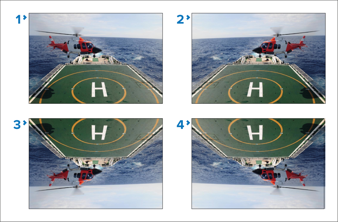 Image flipped and mirrored / reverse view — For cameras facing aft, where the camera image appears upside-down.