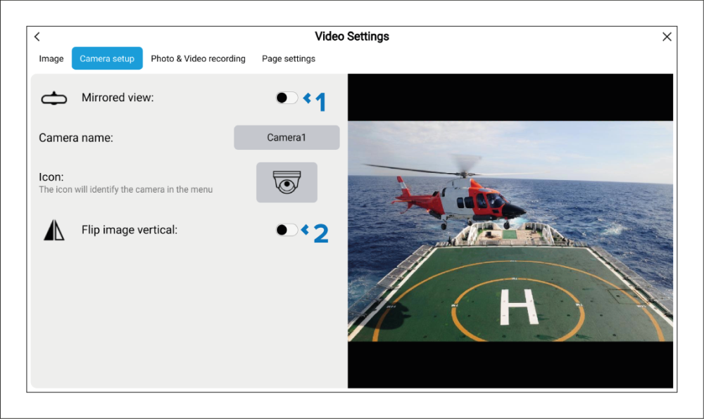 Depending on the specific type of camera connected, the video feed can be flipped upside down and reversed.