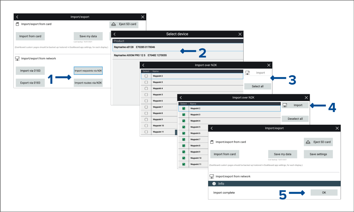 Follow the steps below to Import Waypoints or Routes over an NMEA 2000 / SeaTalkng® network.