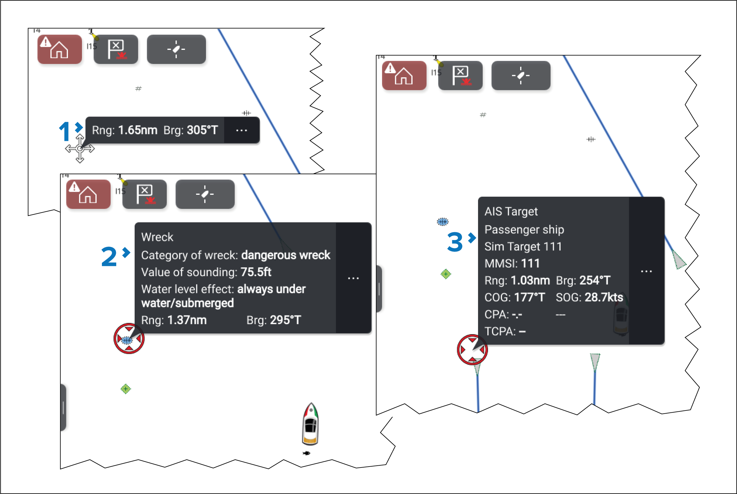 In the chart app, the default behavior when the screen is selected is to display an Info box. The Info box provides information related to the selected location or object. From the Info box, the context menu can be displayed by selecting the “3 dots” menu icon.