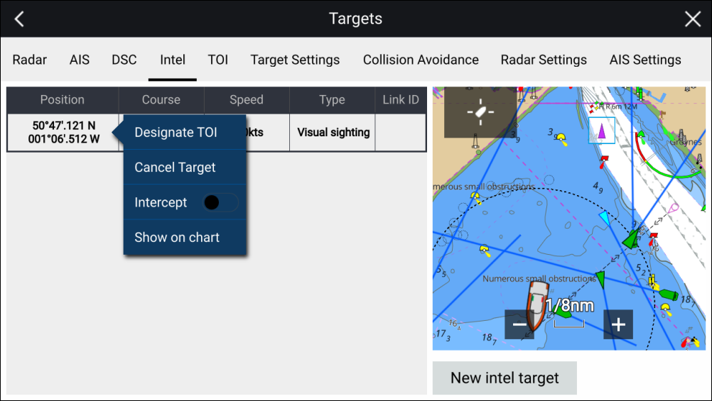 The target list identifies the target position, course, speed and the type of intel the target is based on (i.e.: Visual or Reported.). If the target has been designated as a TOI then the related Link ID will also be displayed.