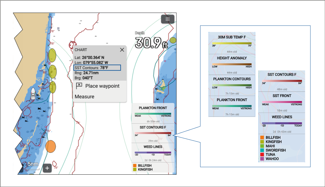 A legend identifying which layers and fish types are currently enabled can be displayed onscreen using the Show Legend option from the Chart app menu. When several layers/fish types are enabled, you can scroll the legend to see all enabled items.