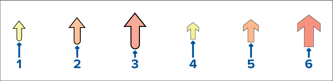 When the Tides layer is enabled or when the Chart app is in Tides mode, the standard Current station symbol is replaced with a dynamic Current graphic. Arrows are used to indicate the direction of current flow. The size and color of the arrow indicates the strength of the current: