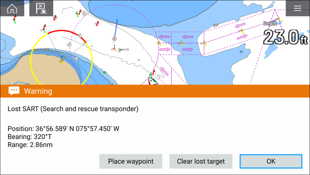 select OK to dismiss the alarm and keep the target onscreen. The target can be cancelled or a waypoint can be placed from the context menu.