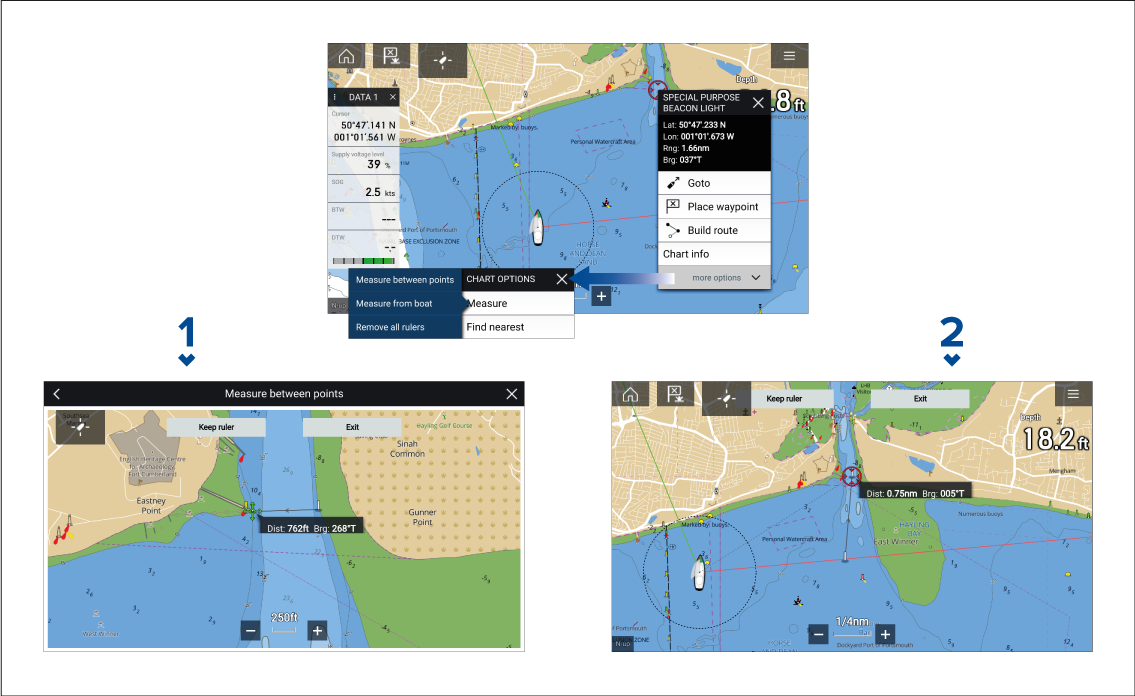 The Measure feature can be used to measure distances from your vessel or distances between 2 points.