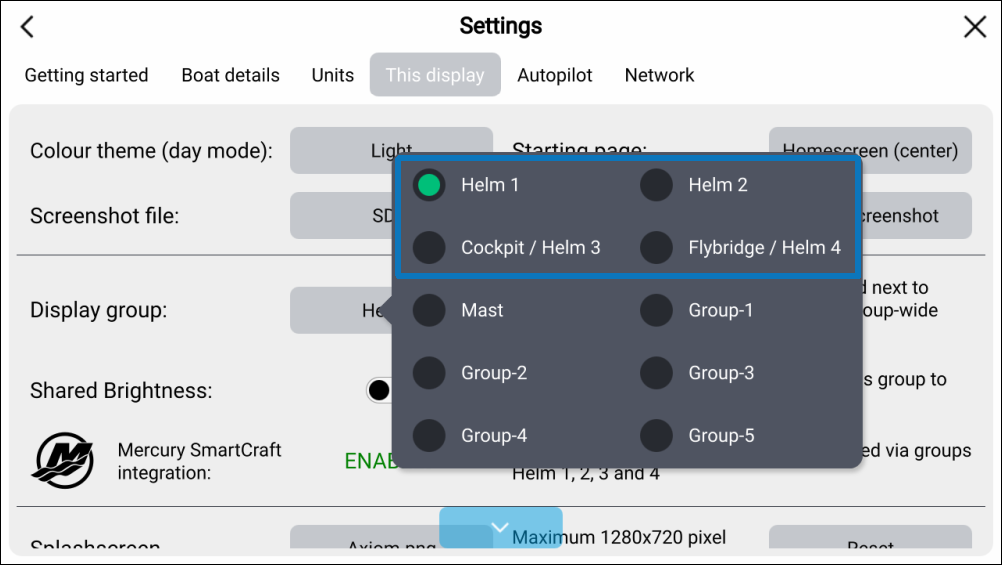 Mercury SmartCraft integration is only available on displays assigned to display groups Helm 1, Helm 2, Helm 3 and Helm 4.