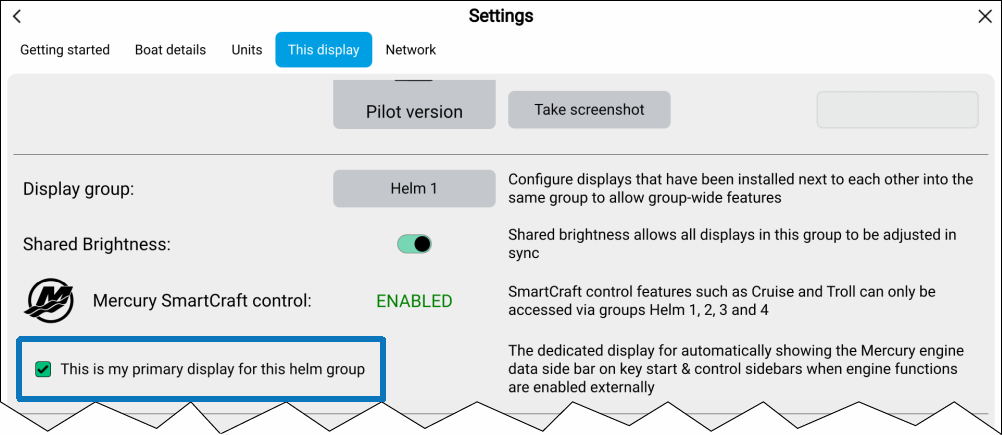 To assign the primary display, select the This is my primary display for this helm group from the This display settings menu: .