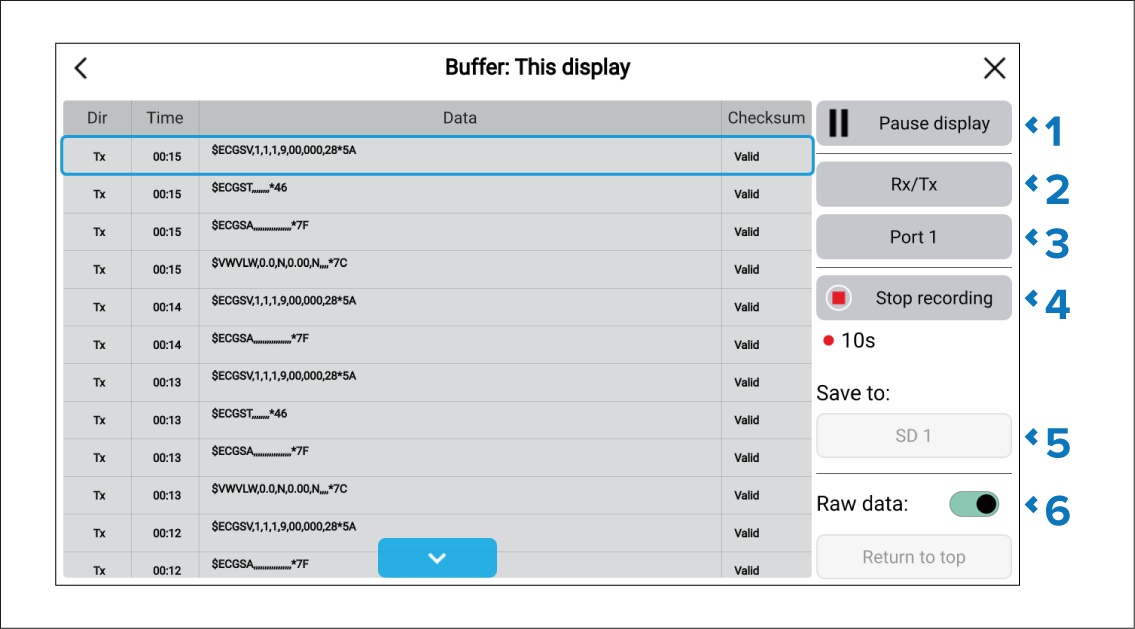 You can view and record data transmitted to, and received from, connected NMEA 0183 devices.