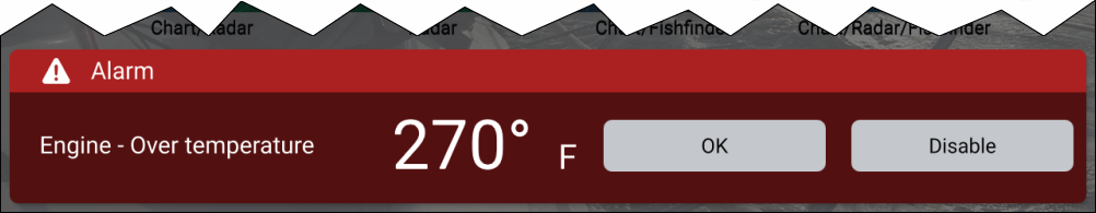 An alarm is displayed when the display receives an alert message from a compatible engine management system. This alert may be received directly or via an interface or converter.
