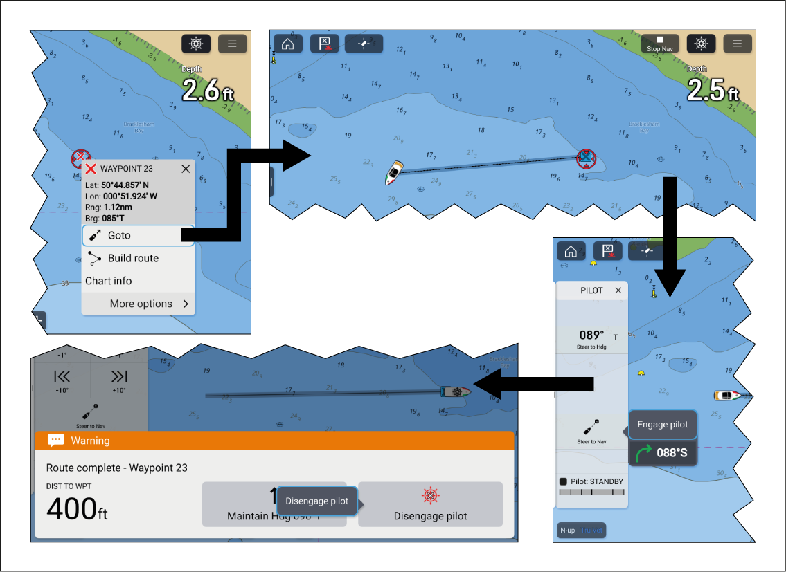 The waypoint Arrival radius (pilot in track mode) can be set from the Alarms manager: Homescreen > Alarms > Settings > Arrival radius (pilot in track mode). The Arrival radius (pilot in track mode) overrides the standard Arrival radius notification.
