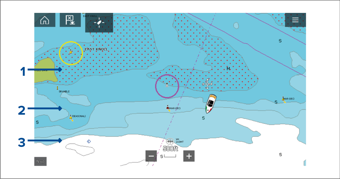 Shallow area — When the Shallow area feature is enabled all depths from zero to the depth specified in the Zero to: setting will use red cross hatching to identify shallow areas.