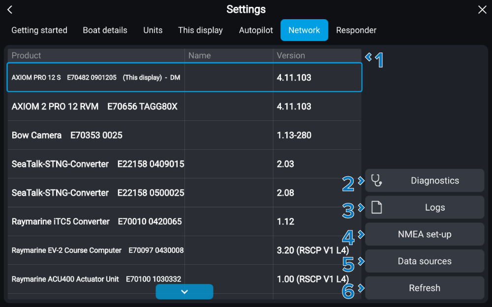 The Network settings menu provides network related information and settings for products connected to the same Ethernet (RayNet) network and SeaTalk NG/NMEA 2000 network as the chartplotter. The Network settings menu also provides access to diagnostic, troubleshooting and configuration settings.