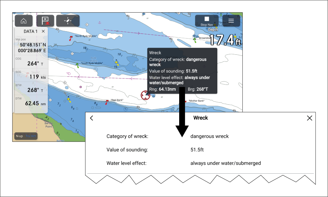 Charted objects can be selected and information about the object can be viewed.