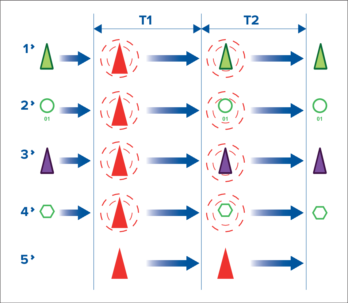 T2 Second delay — After the initial delay period has expired the TOI will revert to using its original target icon but maintain the Red dashed rings around the icon. After a second delay period expires the Red dashed circles are removed and the target reverts to using its original target icon. After the second delay period expires the target is no longer designated as a TOI.