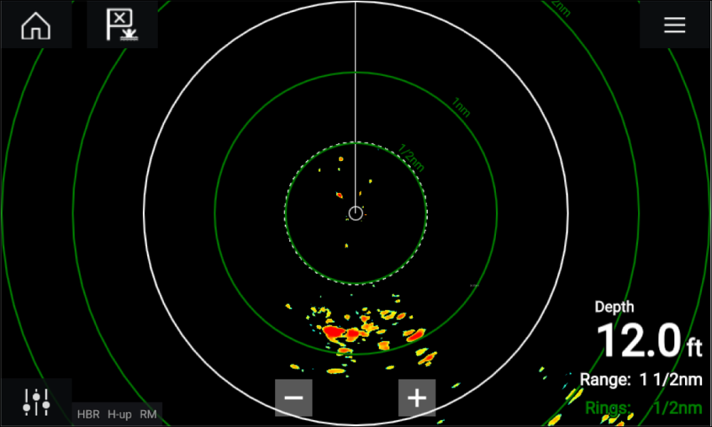 If your Radar scanner is connected, powered up and transmitting then the Radar image is displayed and echoes/targets are displayed onscreen.