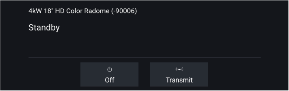 Select On to power up your Radar. If the ‘Radar not found’ message is displayed then a connection could not be established, ensure that network and power connections to your Radar and MFD are correct and free from damage and then power cycle your system. If the Radar scanner can still not be found refer to your Radar’s installation documentation for further troubleshooting information.