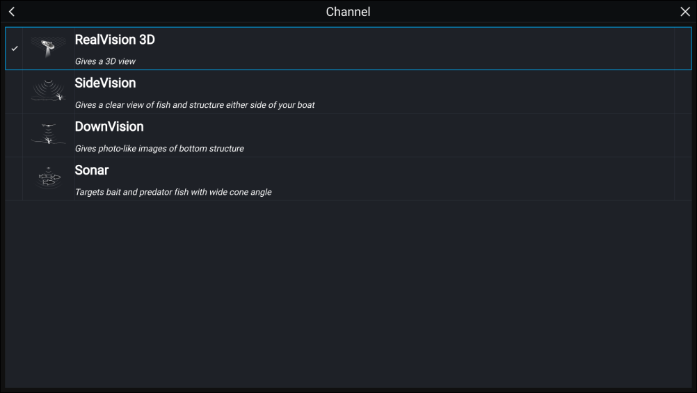 SonarChannel selectionThe first time you open a new app page that includes the Fishfinder app you will need to select a Sonar channel.