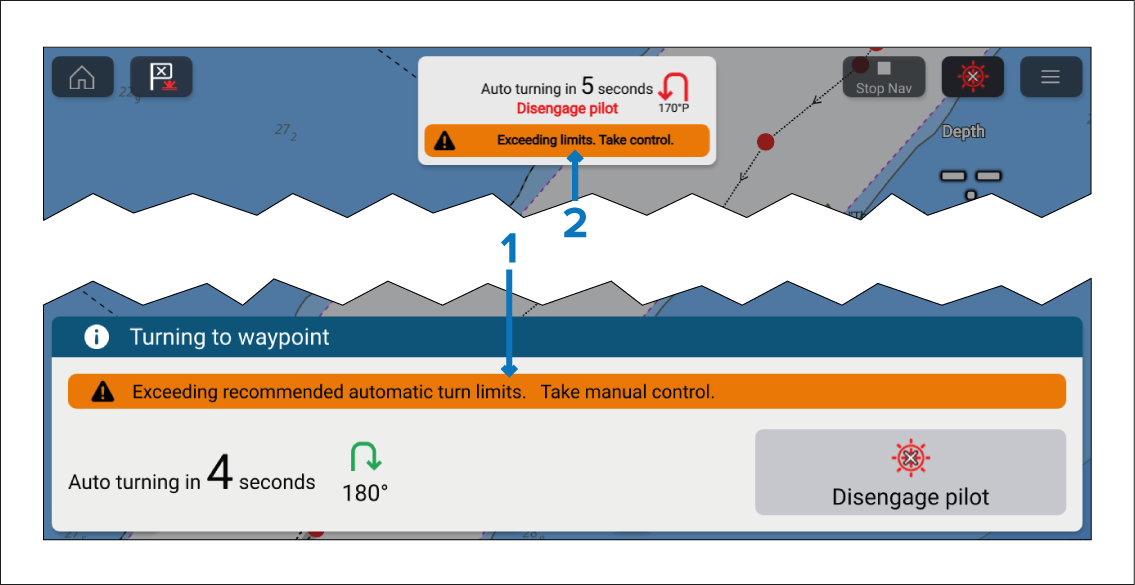 When following a route using automatic turning, route waypoints must be spaced farther apart than the distance specified in the waypoint Arrival radius (pilot in track mode) alarm. If the next waypoint in a route is present within the arrival radius, the Exceeding recommended automatic turn limit warning is displayed.