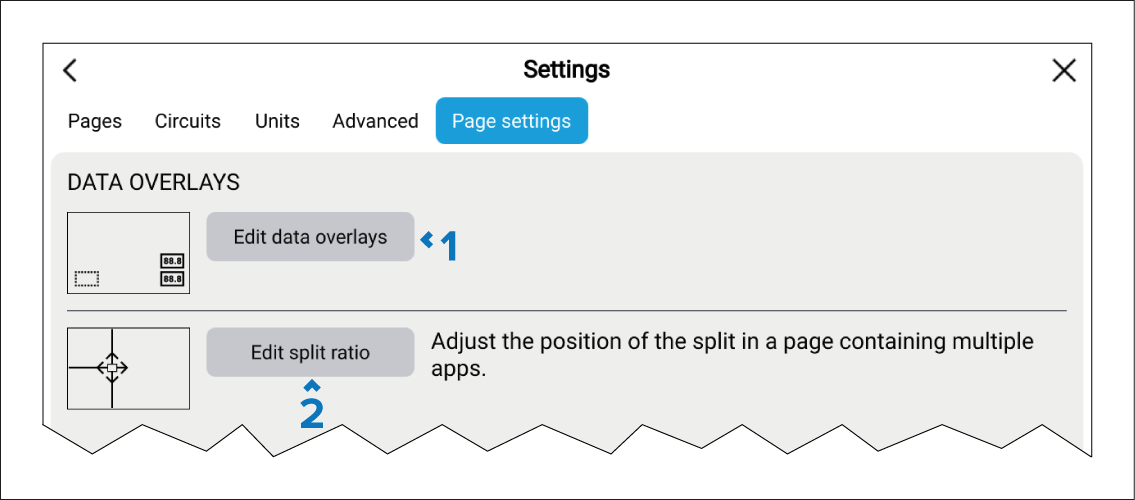 The page settings menu allows you to configure data overlays and, when applicable, adjust the position of the split on pages containing multiple apps.