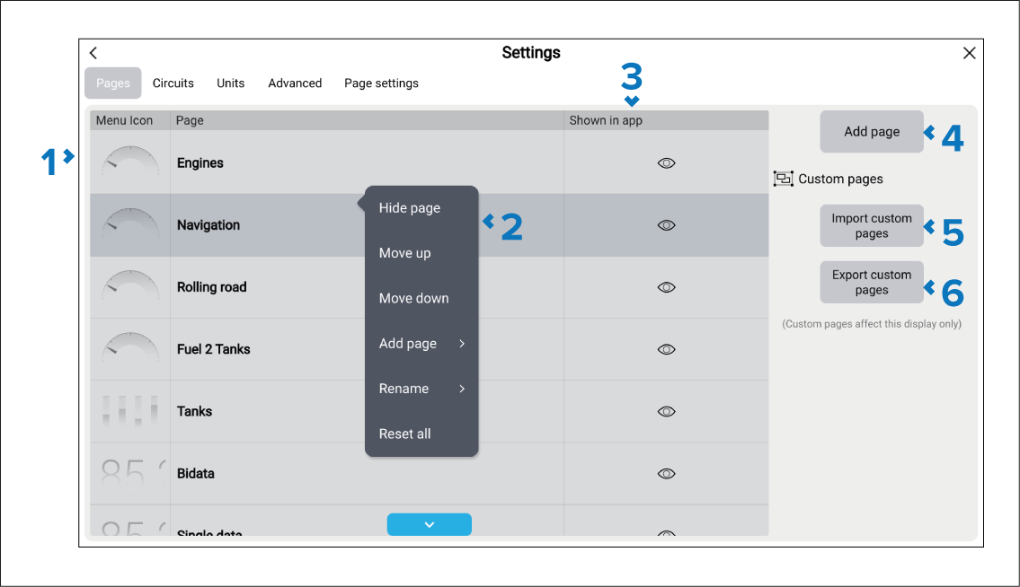 Pages settings menu