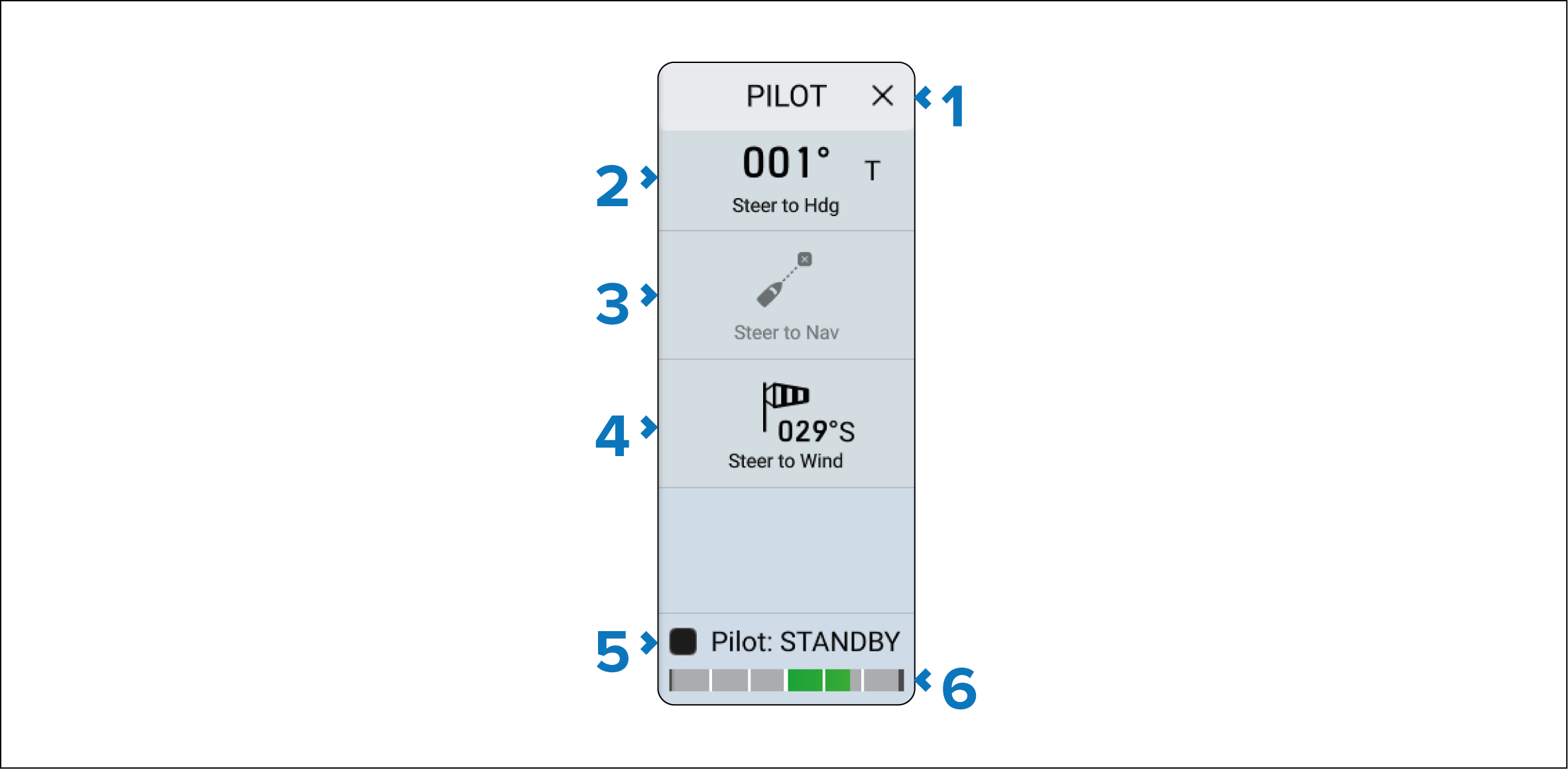 Steer to Hdg Steer to Hdg — Enables you to engage the autopilot in Locked heading (Auto) mode. |