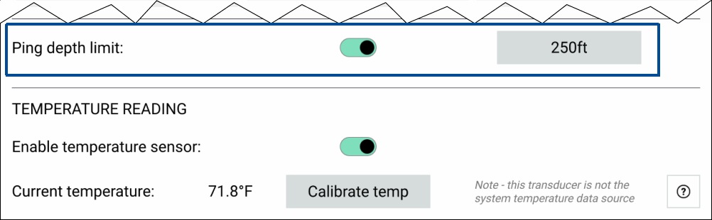 When using a CHIRP or non-CHIRP high power (greater than 600 W) transducer connected to the 1 kW transducer, the Ping depth limit control will be available in the Fishfinder app’s Transducer settings menu: .