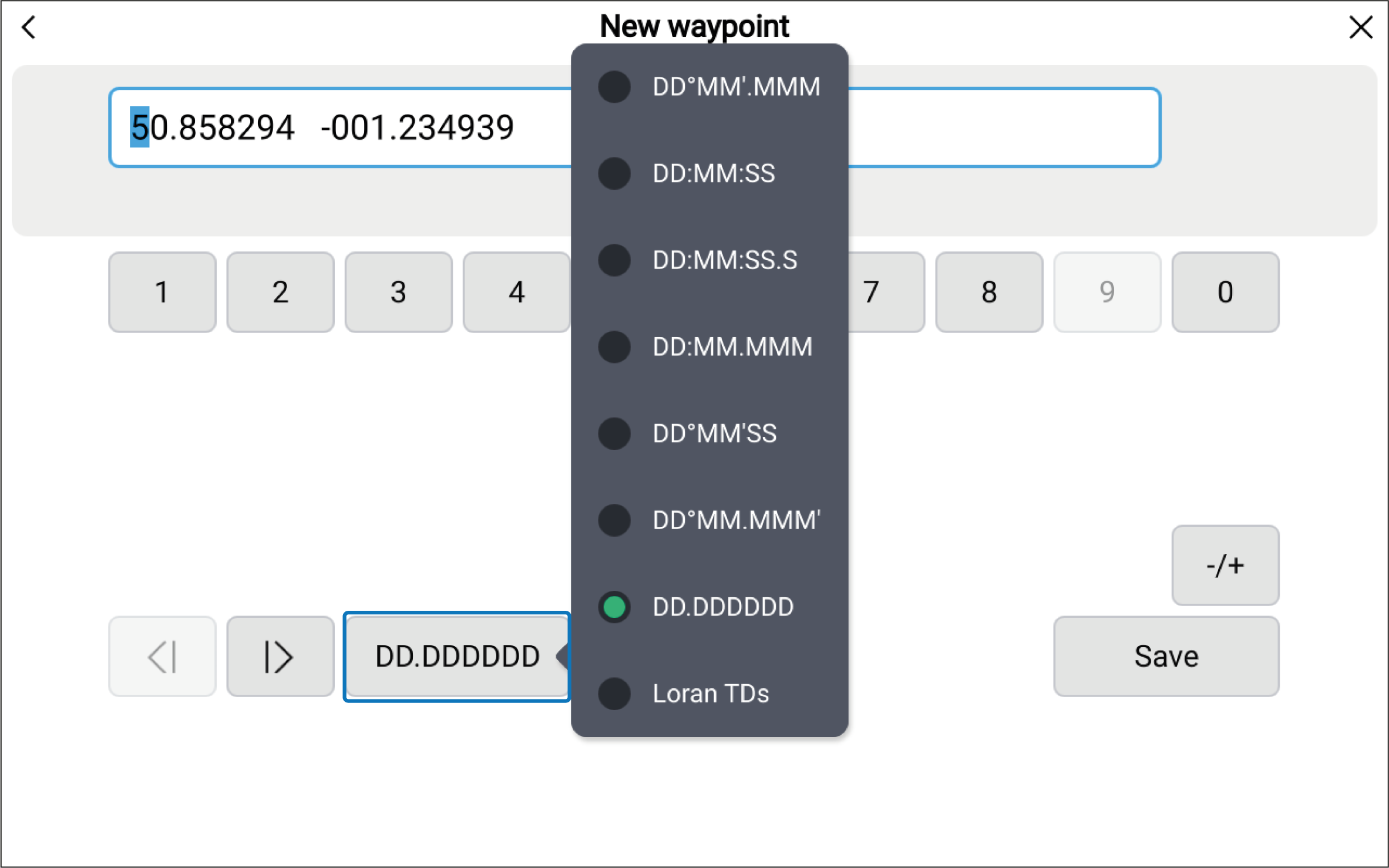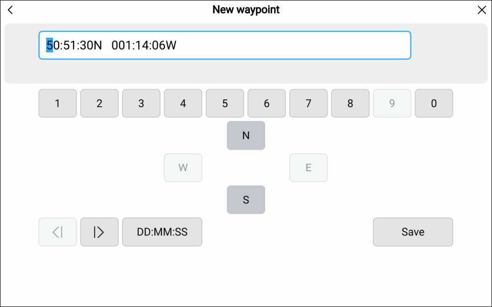 NoteThe saved waypoint details will show the coordinates in the format that has been selected in the display’s Units settings menu: Homescreen Settings Units Lat / Long format. Not all inputs formats may be available