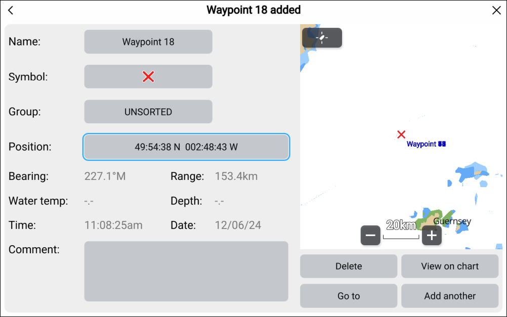 Note*Data is only populated when the Waypoint button or onscreen Waypoint icon is used to create a waypoint at your vessel’s current location.