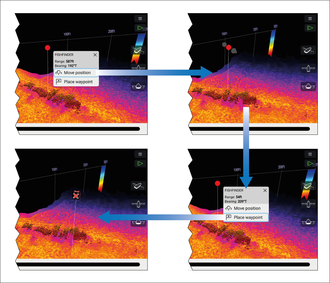 Placing a waypoint in the 3D Vision channel To place a waypoint whilst viewing a 3D Vision channel follow the steps below. WaypointPlacement3DWaypoints Select and hold a location onscreen. The Waypoint context menu and red waypoint marker is displayed: If required, select Move position and then use your finger to drag the waypoint marker to change its position. Select Place waypoint to create a waypoint at the marker’s location. Parent topic: Placing a Waypoint (Sonar, DownVision and SideVision)