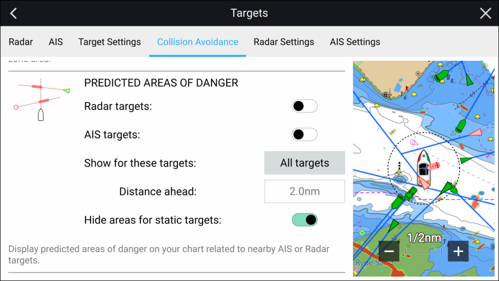 Hide areas for static targets — Enables and disables graphics for Static targets, targets travelling less than 2.0 kts will NOT have Predicted area of danger zones.