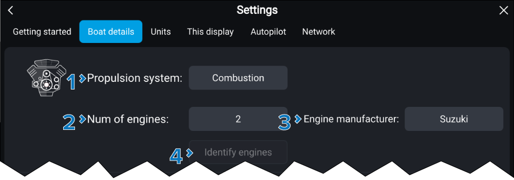 Identify engines:Engine connection wizard Once you have selected the number of engines, select Identify engines and follow the onscreen instructions to configure your engines. May require an extra hardware interface to enable engine data to be displayed. |