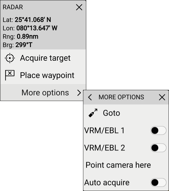 Radar app context menu Context menus provide context sensitive menu options. Radar app Context menu Context menus are accessed in the Radar app by selecting a location or target. The context menu provides Latitude, longitude, range and bearing details for the selected location or object. The context menu provides quick access to relevant settings or features. Select More options to display further options. ContentsAIS target context menuWhen an AIS target is selected in the Radar app the AIS target context menu is displayed.Radar target context menuWhen an acquired Radar target is selected in the Radar app the Radar target context menu is displayed.Moving (dragging) the context menuIn the Radar app the context menu can be moved.Parent topic: Radar app overviewPrevious topic: Radar app controlsNext topic: Camera tracking