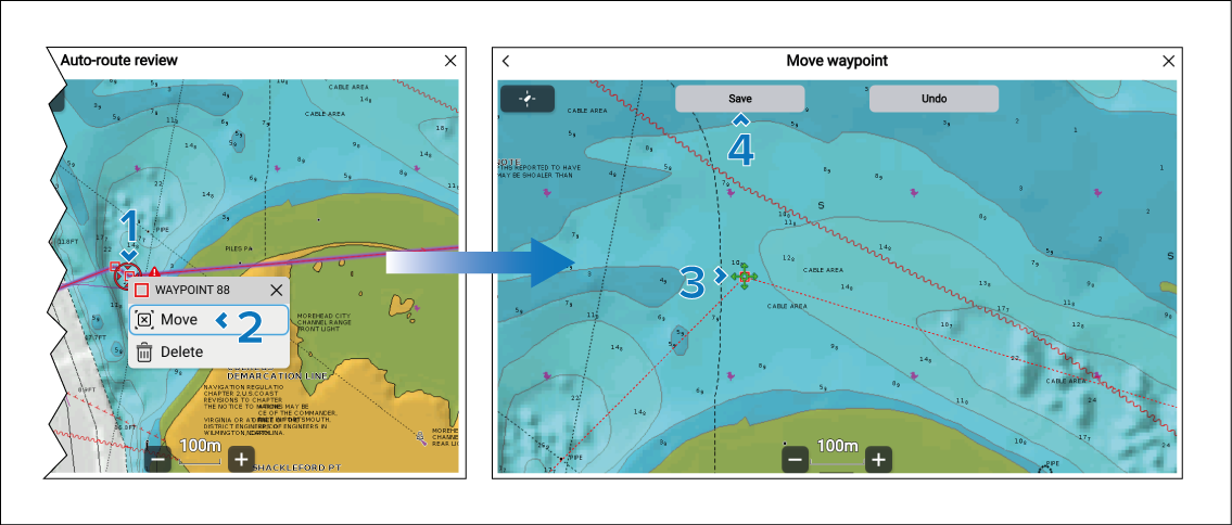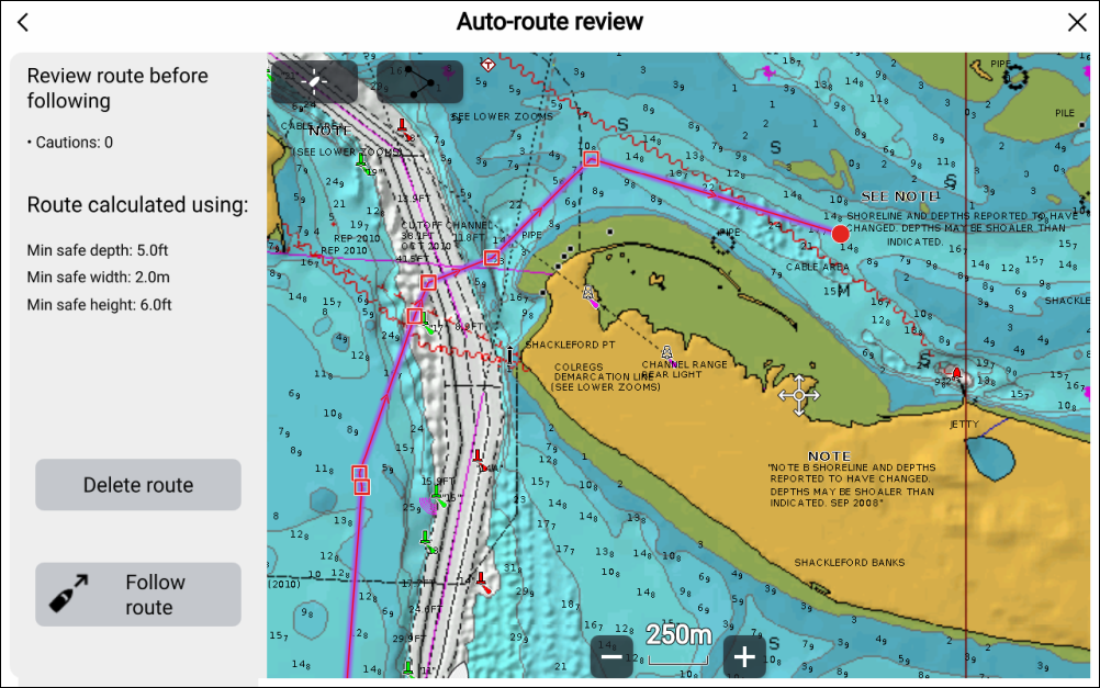 When an automatically generated route includes cautions, the caution areas need to be checked and if required removed before the route can be safely followed. Waypoints within the route can be moved from the Auto-route review menu so that the cautions can be avoided.