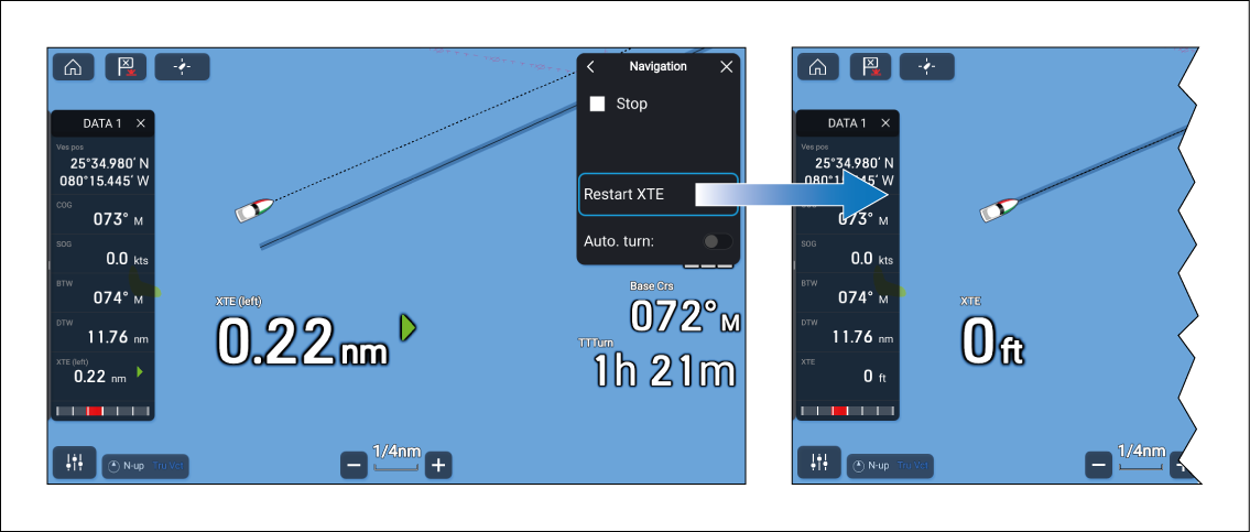 When a cross track error (XTE) exists you can restart the track at your vessel’s current location.