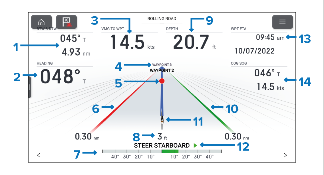 The rolling road data page is always available. The rolling road page includes data relevant to navigation and includes a graphical rolling road.