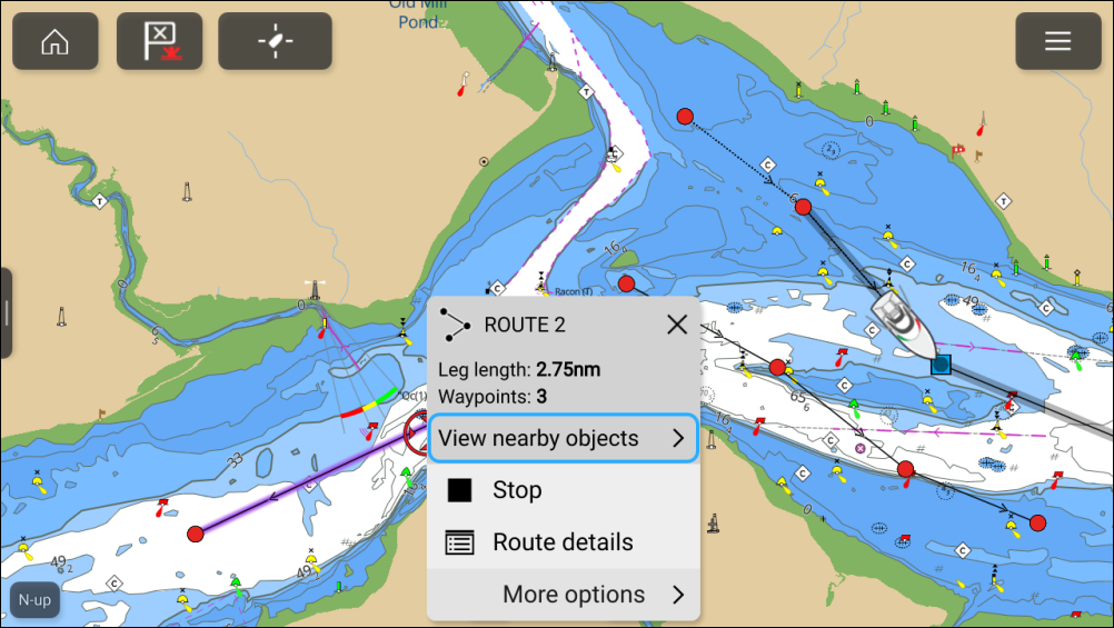 Followed route — A route currently being followed has the current route leg and future route legs highlighted. The highlighting is dynamic, with highlighting removed from route legs already completed.