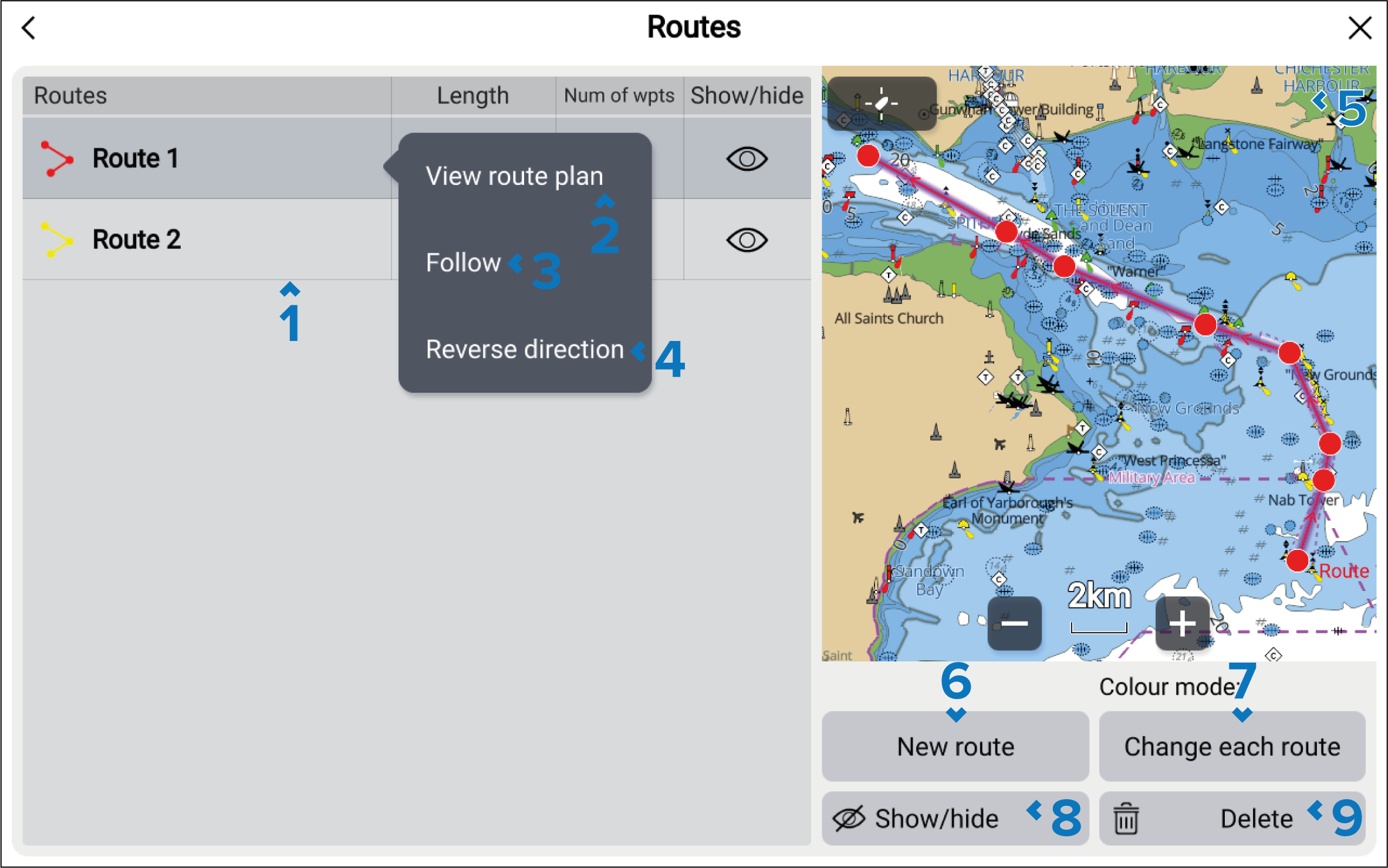 Reverse direction — reverse the route’s direction. Selecting Reverse direction will overwrite the original route, swapping the start and end waypoints so that the route can be followed in the opposite direction. You can revert the route to its previous direction by selection Reverse direction again.