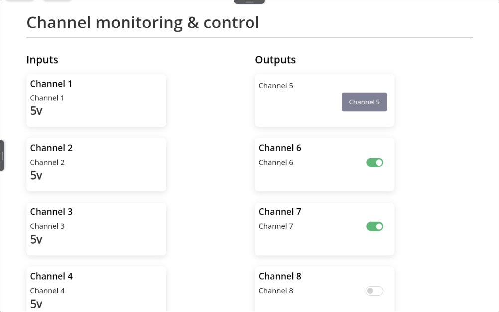 The page allows you to view the status of input channels and switch output channels on and off.