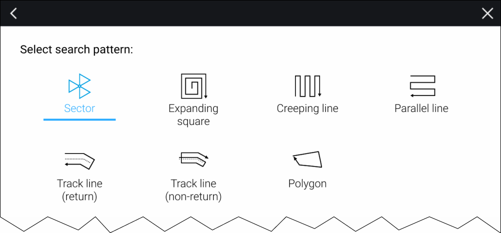 SAR Patterns are routes that can help you find an object in the water. Different types of SAR pattern are available and can take the effects of current/tide into account, enabling a more accurate and consistent route to search. SAR Patterns can be created on your MFD in the Chart app.